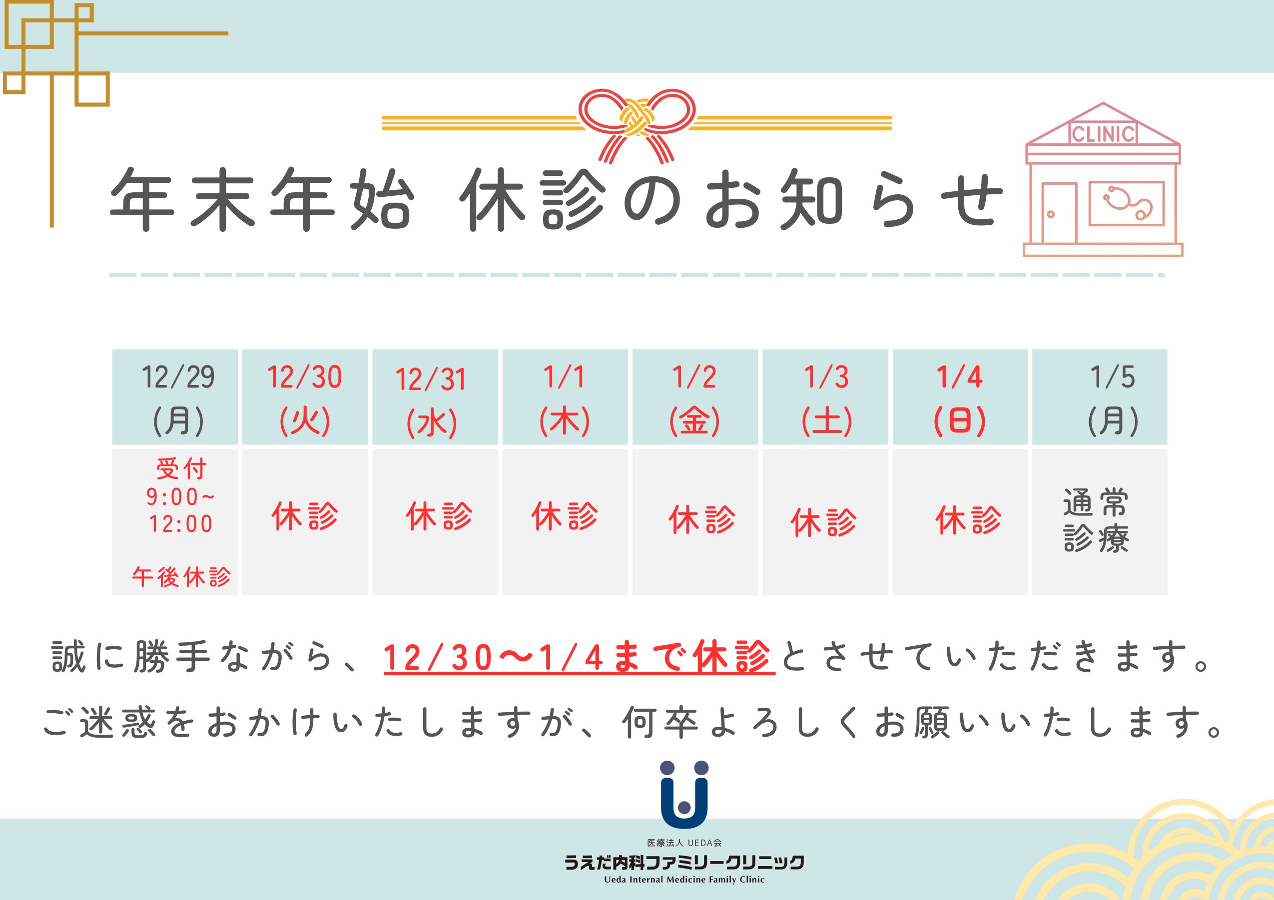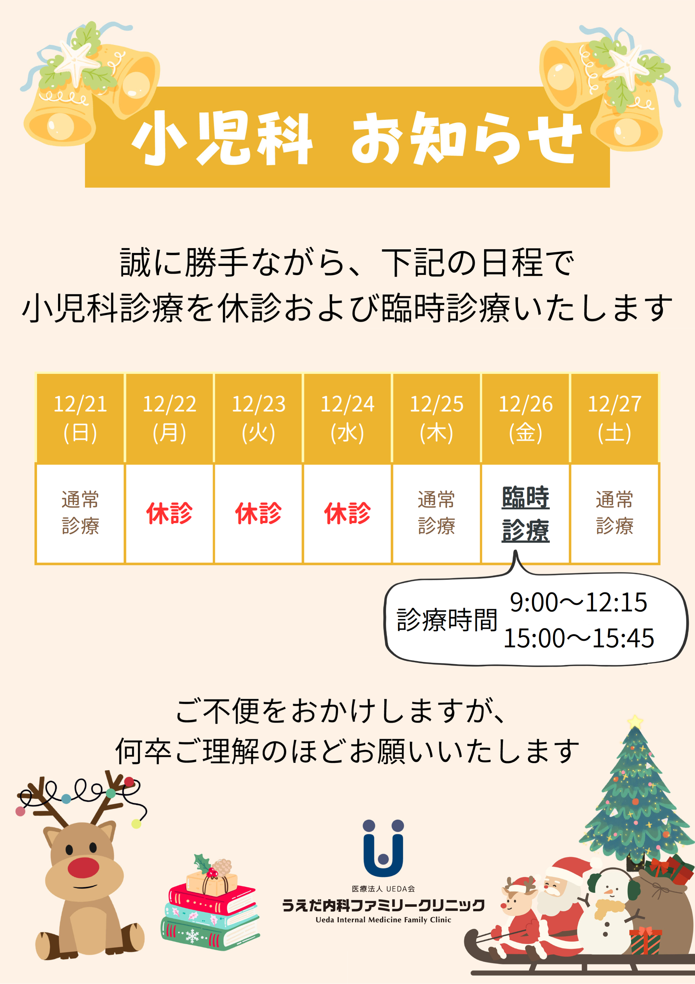 2025年12月22日(月)〜24日(水)まで小児科のみ休診いたします。